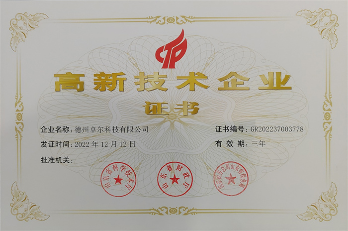 2月6日,山東省科學技術廳、山東省財政廳、稅務總局山東省稅務局聯合頒發“高新技術企業”證書,認定德州卓爾科技有限公司為高新技術企業。